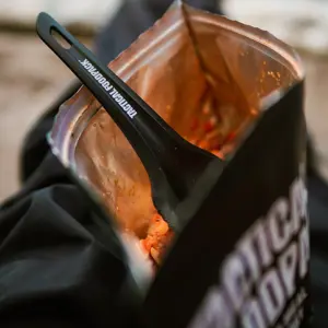 The meals are packed in high-quality stand-up pouches with a grip closure. The food can be heated in various ways within the packaging, such as using the optional Tactical FirePot, the Heater Bag, or over an open campfire. After removing the header from the sealed top and opening the pouch, you can pour in some cold or boiling water.